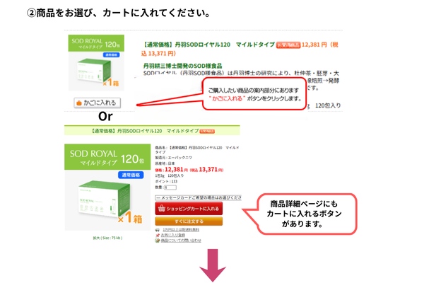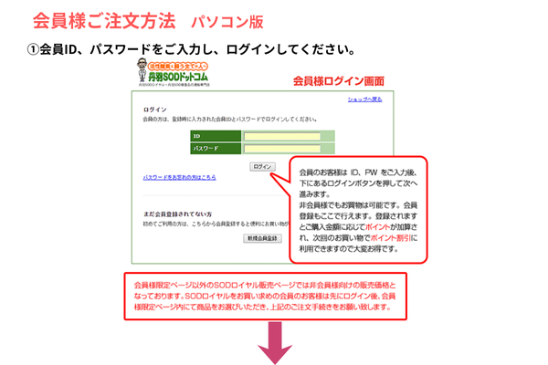 当サイトのページ左側上部にございます、“会員様ログイン”より会員登録時に設定していただきました会員IDとパスワードを入力しログインしていただきますと“会員様限定ページ”内にございます会員様限定のSODロイヤル販売ページよりお買物が可能になります。